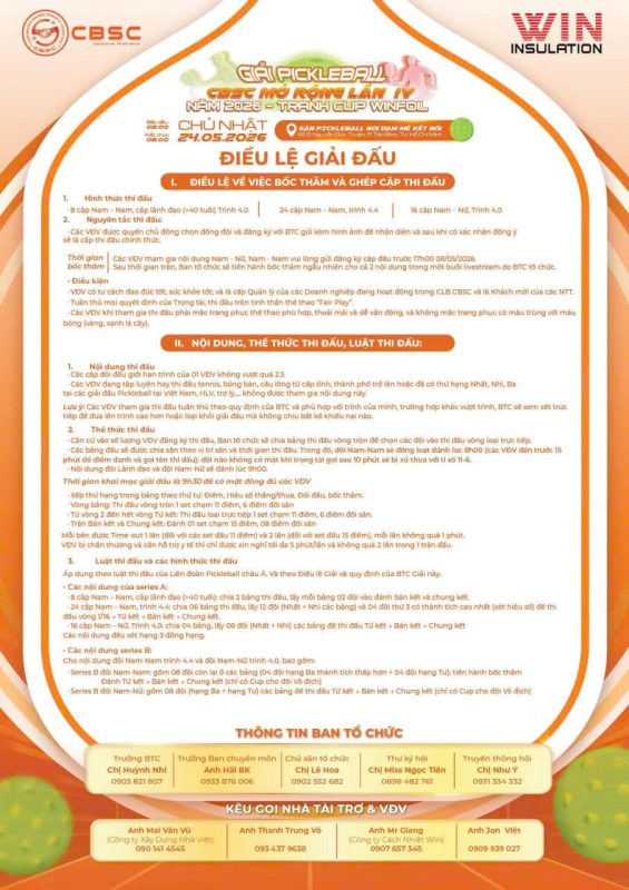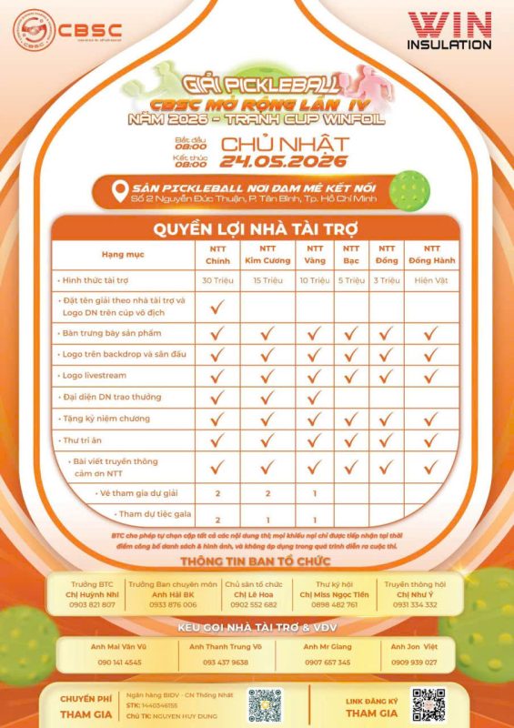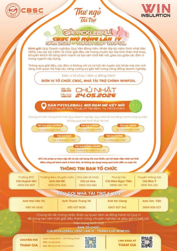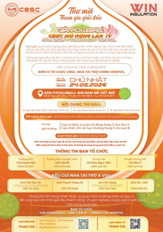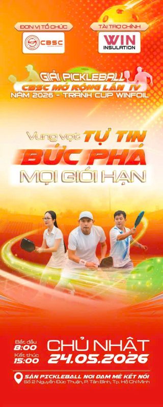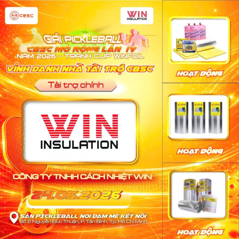Trong xu hướng phát triển bền vững, các hoạt động thể thao doanh nghiệp không chỉ dừng lại ở rèn luyện sức khỏe mà còn trở thành cầu nối quan trọng giúp kết nối cộng đồng. Năm 2026, Công ty TNHH Cách Nhiệt WIN (WIN Insulation) tự hào là Nhà tài trợ chính cho Giải Pickleball CBSC Mở rộng lần IV.